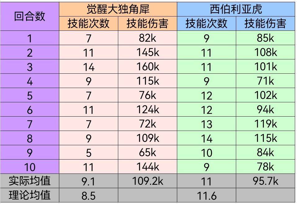 觉醒后,大独角犀技能释放稳定,虽然次数没西伯利亚虎高,但是伤害略高于西伯利亚虎。