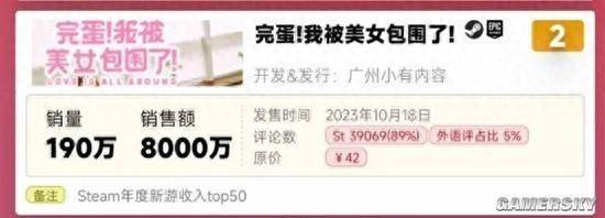 无论从哪个方面来看,《完蛋!我被美女包围了!》(后文简称《完!美!》)的成绩都是令人惊叹的。在销量上,作为去年十月份才发售的作品,《完!美!》在上线之后直接登顶Steam畅销榜。短短两三个月的时间,就斩获了全年国游销量第二的宝座,卖出了超过190万份,远远地甩开了后面的作品。