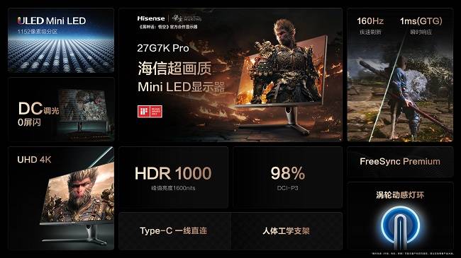 海信电竞显示器 27G7K Pro作为《黑神话:悟空》官方合作显示器,凭借与海信万元级电视同源的ULED mini LED技术,实现对1152个独立区域的动态控制,配合1600nits的峰值亮度,精准呈现西行之路的万千光影变化,让细节一览无余。
