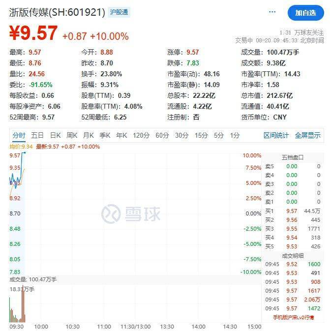 8月20日,开盘后约15分钟,浙版传媒拉升至涨停,报9.57元/股。