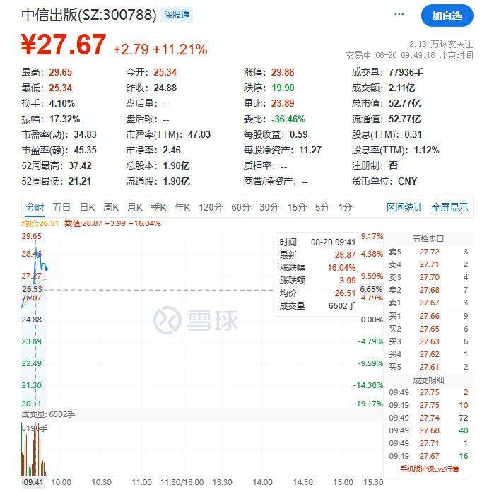 中信出版今日早间也一度涨超16%,截至发稿时涨11.21%,报27.67元/股。