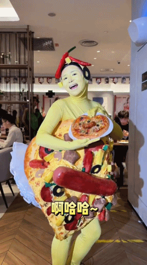 还有这位就更离谱了,直接把自己打扮成了“披萨”来吃披萨!