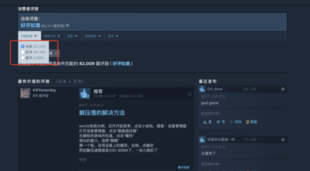 目前,该游戏在Steam平台好评率维持在96%以上水平,其中中文评论占比约为90%,可见Steam平台中国玩家占绝大多数。
