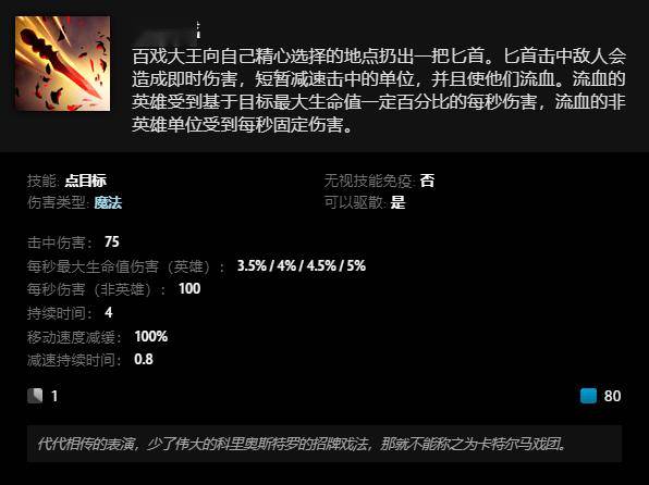 该英雄提供驯兽术、逃生技、尖刀戏、奇观轮、聚光灯五个常规技能,既有控制又有救人,既有辅助效果又有输出伤害。