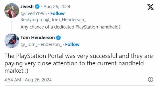 据称,在PS Portal取得意外成功后,索尼可能再次入局掌机市场,毕竟其热销状况远超索尼的预计销量。著名舅舅党Tom Henderson透露:在PS Portal成功之后,索尼正在“非常密切地关注掌机市场”。