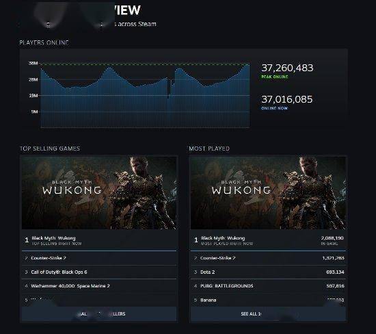 在刚刚结束的周末,Steam的同时在线玩家数再创新高——突破3700万大关,据悉,其中只有1400万玩家在实际玩游戏,而《黑神话:悟空》贡献最大,200多万玩家沉浸其中,远远甩开《CS2》《DOTA2》等热门电竞网游。
