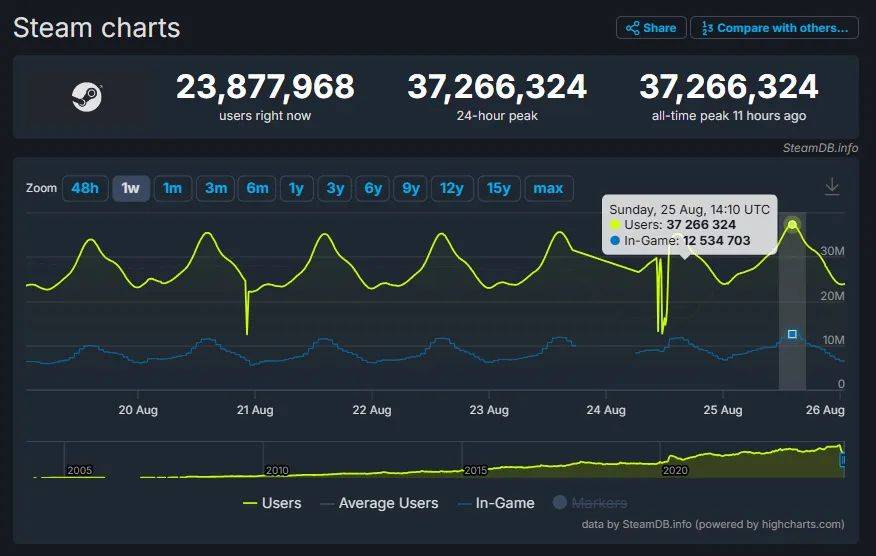 至于PC端,目前上线了Steam/Epic/WeGame,在Steam购买的玩家应该不少。据IT之家报道,SteamDB数据显示8月25日晚Steam同时在线玩家数突破3700万(37,266,324),创新纪录。所有游戏中,《黑神话:悟空》排名第一,其峰值在线人数超过210万。作为补充,Wario64分享的数据显示:虽然同时在线人数高达3700万,但其中只有约1400万用户真正在玩游戏。也有网友猜测黑猴这波给Steam增加了不少新注册用户。问问相关玩家,你购买的哪个平台?