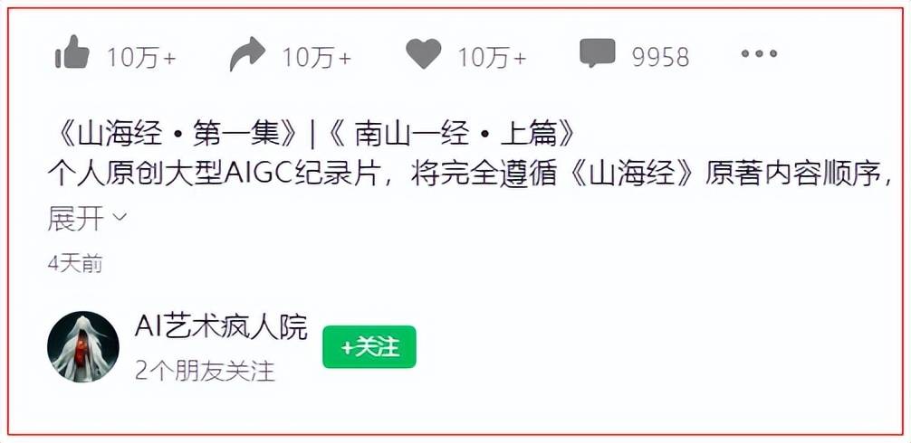 8月22日,一部以《山海经》为蓝本制作的AI大型纪录片在网络上爆红。博主“AI疯人院”不光一夜间斩获千万播放量,视频号转发量也突破10万级,几乎和《黑神话》同时期刷爆朋友圈。一些网友也在评论区直接把二者做关联,认为它的影响力仅次于《黑神话》,是对传统文化的深度致敬。