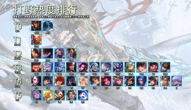 大部分打野的出场率都集中在T3和T4,包括一些强势的打野英雄,比如马超,裴擒虎。之前一直说雅典娜是一个绝活英雄,出场率低但是胜率高,现在一看出场率并不算低,比她低的还有十个,看来雅典娜自身的强度还是蛮高的,要比大部分打野日子过的舒服的多,不然体验服也不会频繁的对其进行调整。