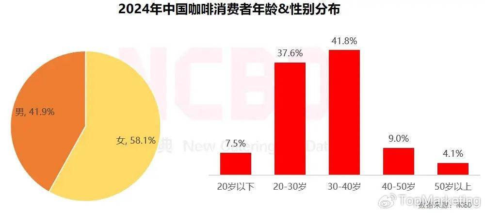 NCBD发布的《2023—2024中国咖啡行业年度发展报告》显示,咖啡消费者的性别分布中女性为主要群体,占58.1%;男性占比为41.9%。