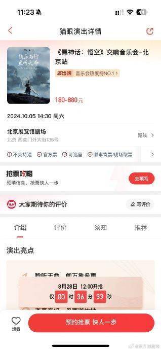 【《黑神话:悟空》线下音乐会开票:2分钟售罄 包含19首曲目】近期,国产游戏《黑神话:悟空》吸引了全球游戏爱好者的广泛关注,相关讨论迅速在各大社交媒体平台上蔓延开来,成为热议的焦点话题。该游戏上线不到一周,线下主题音乐会就官宣开票了。 8月28日,由保利演艺携手《黑神话:悟空》共同发起的线下主题音乐会正式开票,开票后2分钟就已售罄。 目前确定巡演城市包括深圳、上海、北京、杭州、重庆。北京站定于10月5日在北京展览馆剧场下午、晚上连演两场。