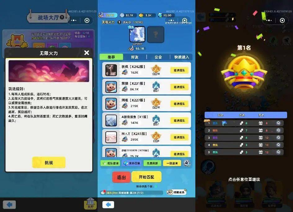 核心的竞技玩法+外围卡牌养成,已经是一个比较完整的游戏结构了,但只有一个匹配竞技玩法未免太过单一。因此,开发团队在常规的匹配玩法之外,还在活动副本中推出了2人组队、5V5夺城、抢豆豆大战、道具大乱斗等其他更多玩法。