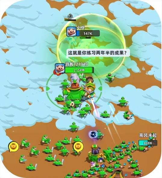 虽然严格来看,该游戏算不上任何一种大热爆款的like,但我们在这款游戏当中,还是能够看到很多老游戏的影子。其中通过跑图招募中立兵团进行作战的玩法,在《等我去喊人》等此前的小游戏中也出现过,且这类玩法也经常被用于制作买量素材。滑动前进,松手自动攻击的设计在休闲竞技类游戏中也经常使用,比如Supercell的新游《爆裂小队》就采用的这种设计。同时,10出1的取胜方式,又很容易让人联想到“吃鸡”的机制,可以说该游戏其实又是一个优秀的“缝合怪”。