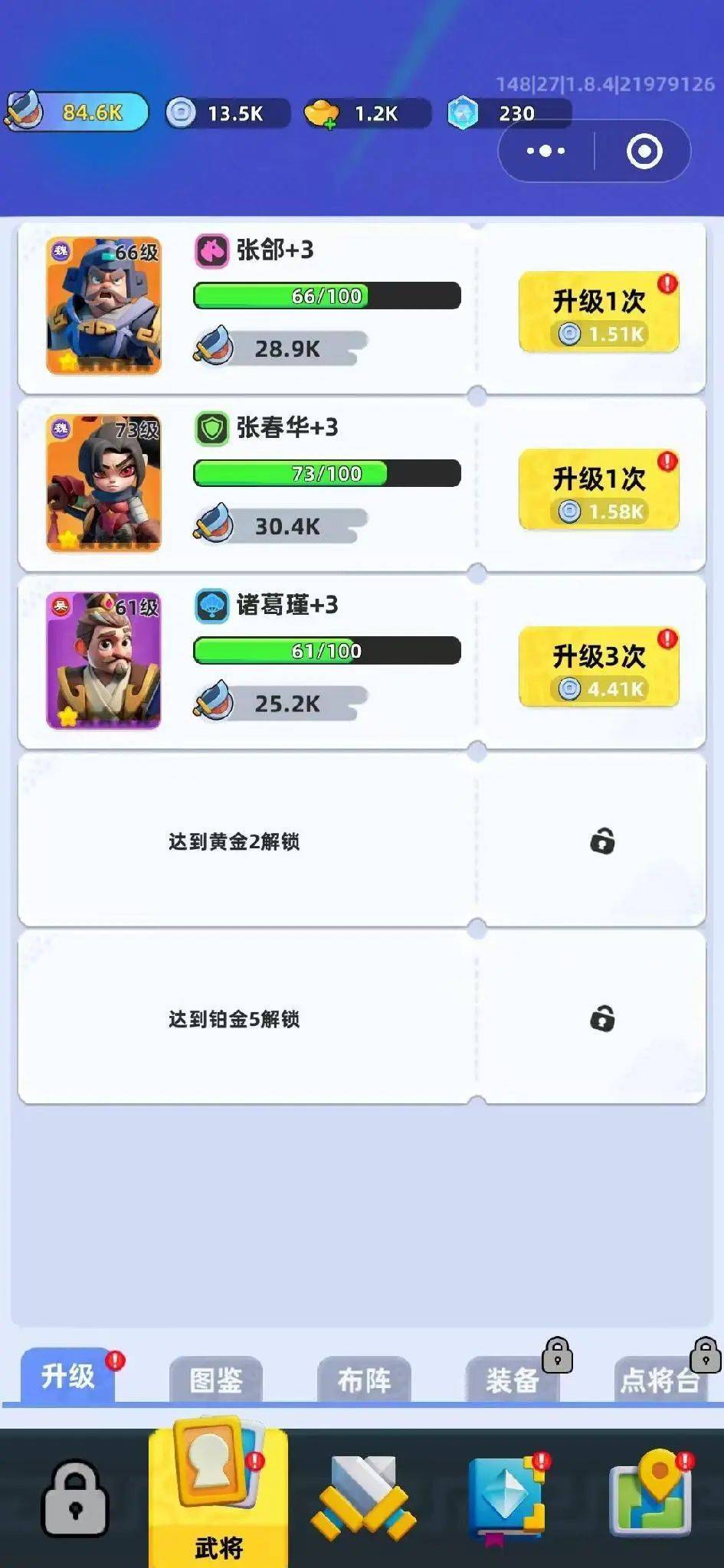在卡牌养成模块里,玩家可以招募获取不同等级的武将,然后通过升级、升星两种方式提升武将属性;还可以通过培养,直接提升我方总属性。