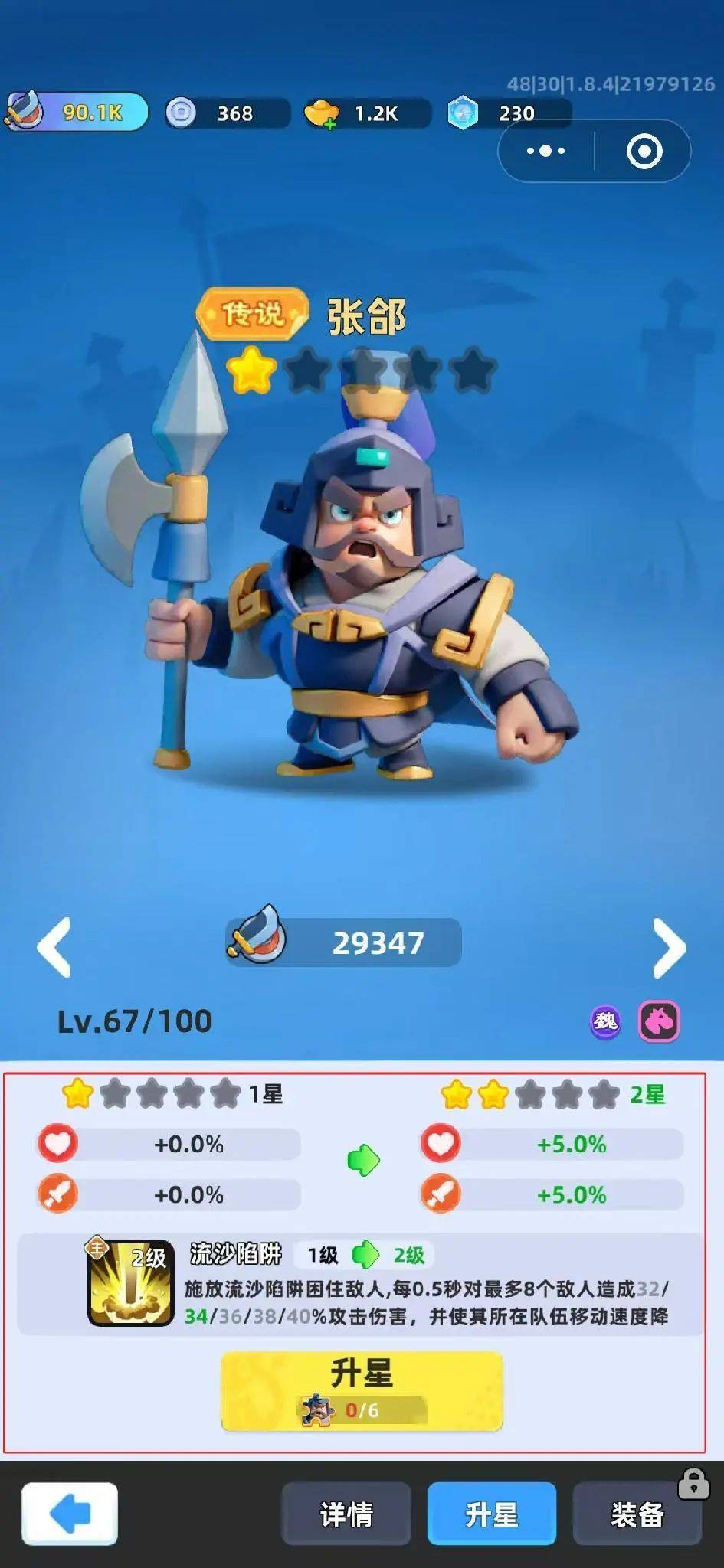 每一个武将初始都自带一个主动技能,玩家可以通过消耗武将碎片对武将进行升星,从而解锁对应武将更多的被动技能或者提升技能等级。