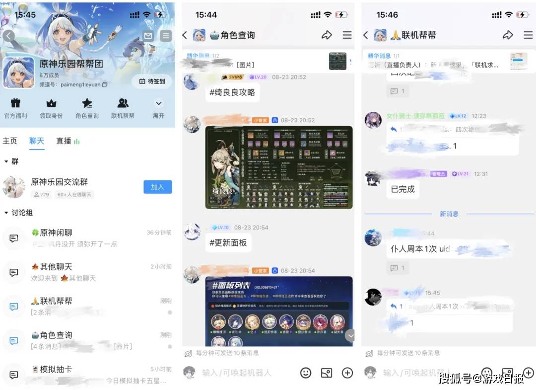 一方面,“原神官方频道”聊天板块是大家交流的核心场景之一,基本3分钟不看就是99+、一晚不看就是3000+未读消息,大家在其他社区工具上交流的“延迟感”在腾讯频道上消失了,有联机合作、找寻攻略需求时会“当场就聊”,这既贴合《原神》玩家想快速解决问题的诉求,也延展培养出了大家看UGC内容时的交流习惯。