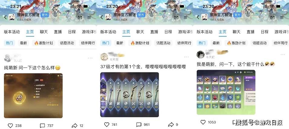 另一方面,当玩家关注“原神官方频道”后,它会以“类好友”的形式出现在QQ主页面消息列表,“时不时发消息”呈现频道最新帖子来吸引玩家点击查看,带来了异步交流的体验,加上新帖的高回复量以及点击发布者头像可私信(实名认证后)/加好友的设定,从心理上交叉刺激着玩家在频道中参与交互的欲望。