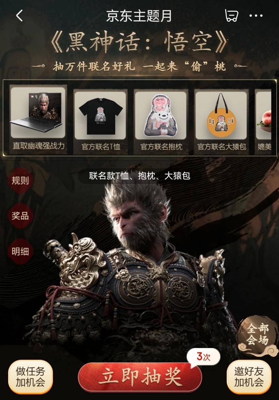 值得一提的是,在《黑神话:悟空》京东主题月活动页面,消费者可以参与活动抽取京东×《黑神话:悟空》联名T恤、京东×《黑神话:悟空》联名抱枕、京东×《黑神话:悟空》联名大猿包、联想拯救者Y7000P、攀升RTX4070S主机、海信电视、平谷蟠桃、喜乐桃桃艺术摆件等万件联名好礼。