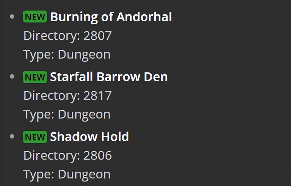 PTR上的补丁文件为1.15.4,外媒在其中发现了三块被标注为地下城的新区域:Burning of Andorhal(燃烧安多哈尔)、Starfall Barrow Den(星陨兽穴)、Shadow Hold(暗影要塞),疑似为P5新副本。P4有“屠魔峡谷”,而P5推出三个原创副本,官方值得肯定。