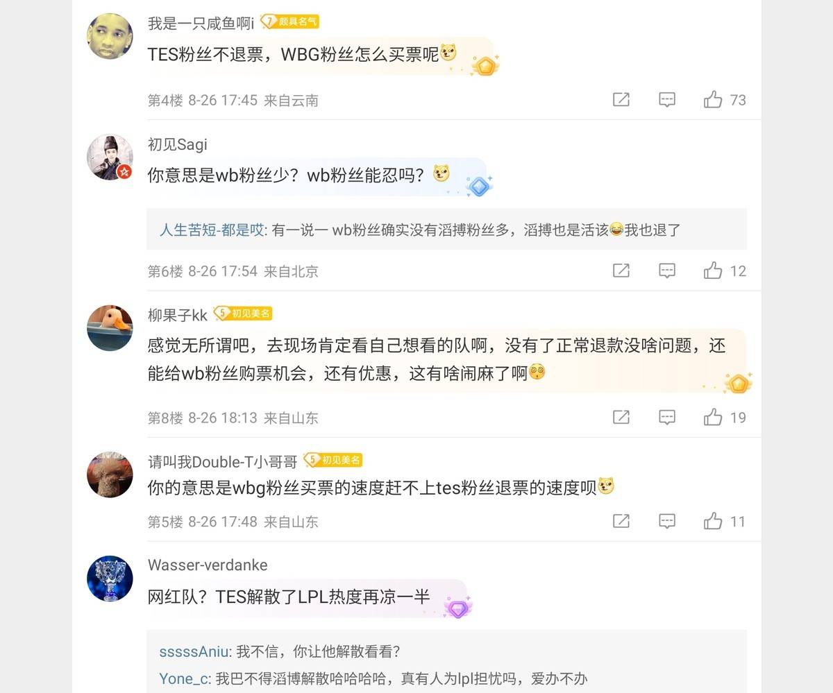 另一部人则认为LPL要完了,如果滔博解散了,联盟的热度至少会再降低一半。由于连续几年成绩不好,收视率完全靠老一代选手撑着,阿水,小天,田野这一代选手退役,就彻底没有明星存在,到时候赛区可能都要无了。