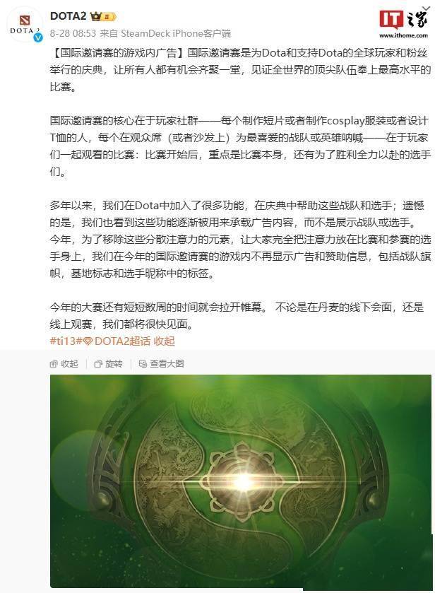 在赛事开始之前,《DOTA2》官方宣布:“今年的国际邀请赛的游戏内不再显示广告和赞助信息,包括战队旗帜,基地标志和选手昵称中的标签。”
