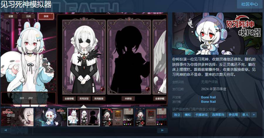 今天(8月31日),骨钉工作室的《见习死神模拟器》在Steam平台正式发售,预计于2024年第四季度推出。该游戏支持简体中文,并提供多种选择给玩家,包括躺在床上摆烂、赚外快和收集服装等。玩家将扮演一位见习死神,在收割灵魂偿还债务的过程中做出各种决策。