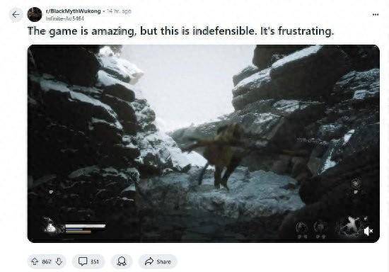 不过,场景内存在的“空气墙”仍是影响很多人体验的一大问题。游戏发售至今,在国外Reddit论坛上依然能看到新帖在吐槽空气墙。玩家认为这种问题存在于《黑神话》如此优秀的游戏身上,实在是遗憾。
