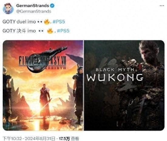 今年夏天,《黑神话:悟空》以强势黑马之姿闯入国外玩家的视野中,其商业成功让任何人都无法忽视它,国外博主GermanStrands也在近日发起讨论:谁是你的年度游戏?拿出了2024年至今的最高分游戏《FF7重生》和《黑神话》同台竞技。