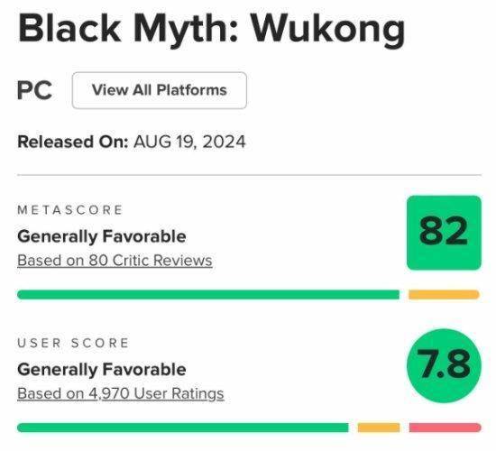 今日,《黑神话:悟空》M站评分小幅度上涨,截至发稿前媒体评分回归8.2分(80家媒体打分),玩家评分升至7.9分。