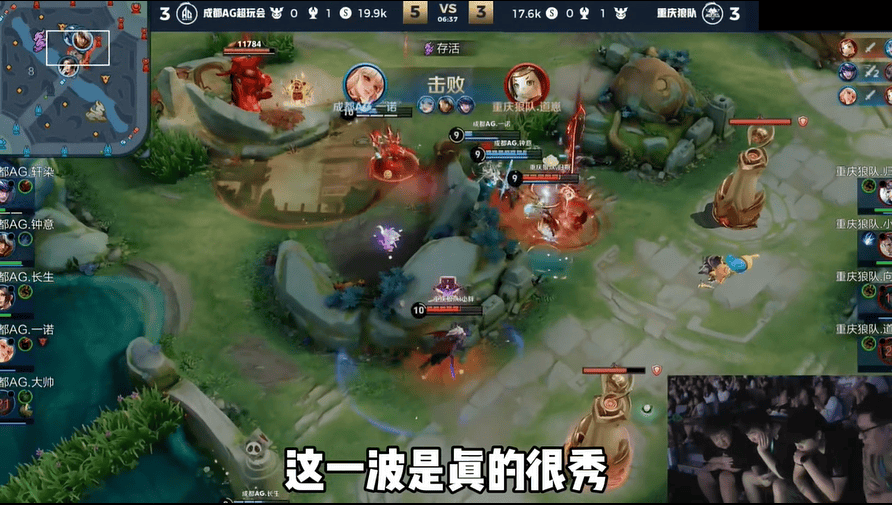 在狼队红区一诺和轩染站了出来,鲁班大师想拉人被公孙离大招推开,宫本大招锁到了公孙离,但是一诺换伞进入人堆,和轩染配合击杀了道崽的鲁班,并且丝血的一诺还撤了出来,这一波是真的很秀。