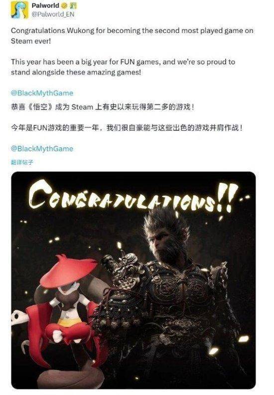官方曾发文祝贺《黑神话:悟空》超越《幻兽帕鲁》成为steam第二受欢迎游戏