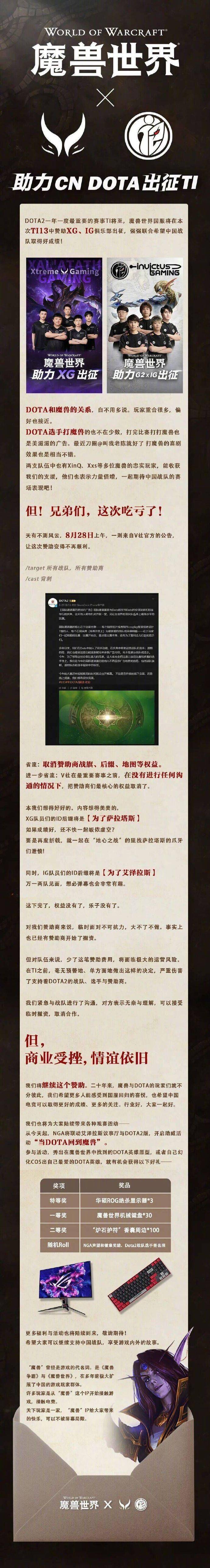 网友表示,给魔兽国服这次点赞。因为前几天V社刚发文限制国际邀请赛的游戏内广告,而昨天魔兽就迎难而上官宣赞助XG和iG两支战队。