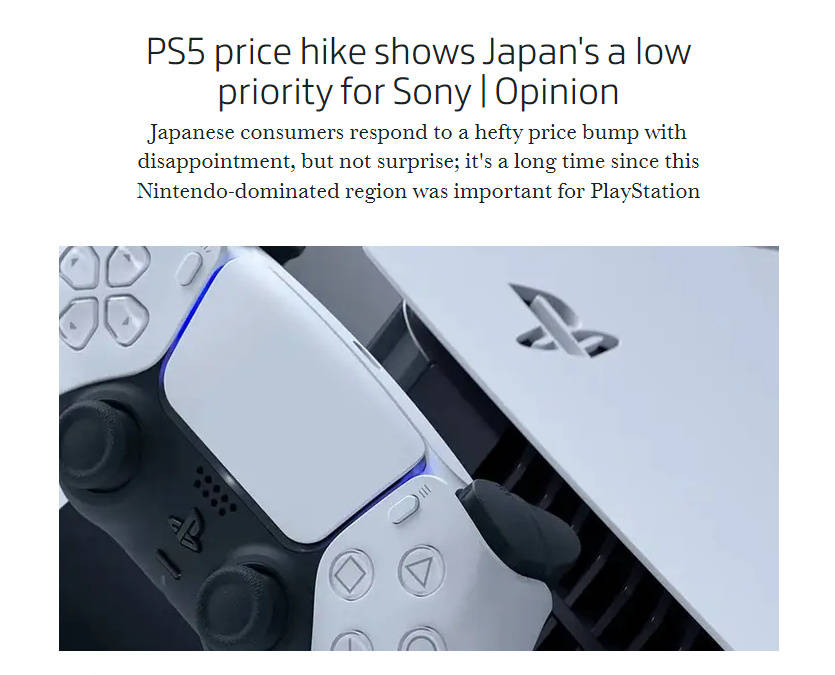 而根据外媒GamesIndustry报道,似乎连日本“本土”企业索尼都不看好日本市场,近日他们发布了一篇名为“PS5涨价显示索尼对日本市场的重视程度逐步降低”的文章,从最初索尼将总部搬至美国、PS5以及配件涨价再到索尼在日本市场的销售表现并不尽如人意,这一步步下来也应证了文章的想法。