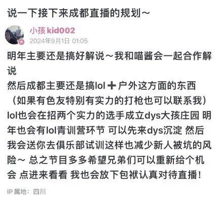 虽然解散,但是德云色也有后面的安排,这么多直播员分成两部分:一部分跟kid去成都做直播,主要做LOL相关的,kid自己也发文表示打算明年做大孩庄园,计划给LPL培养青训选手;另一部分则是去黑莓的老家养牛做户外。只是笑笑和西卡两人不做了。