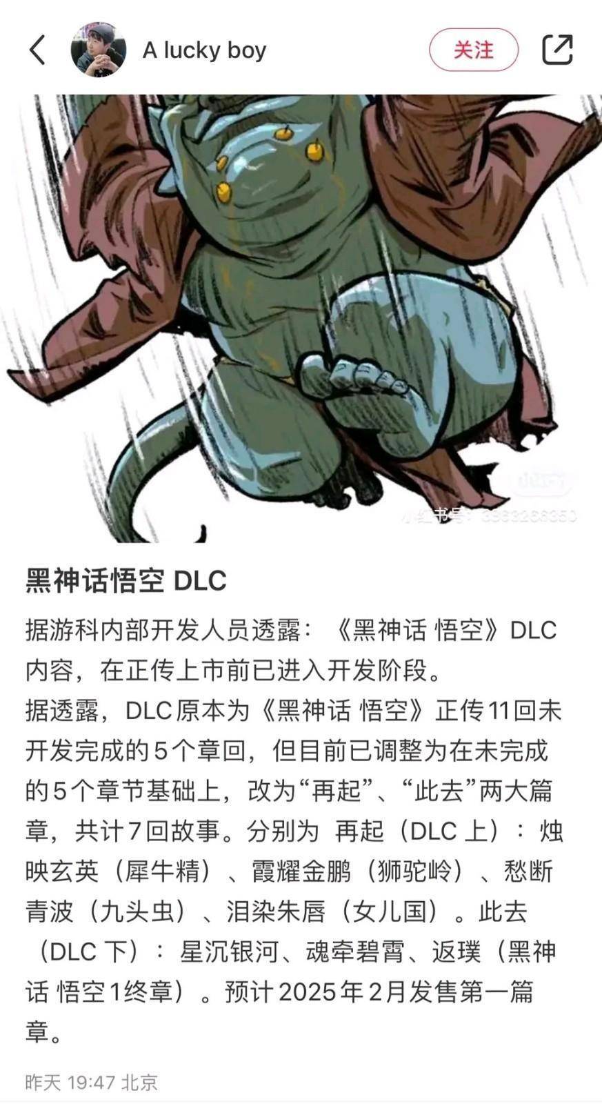 据一位自称是游科内部开发人员透露,DLC原本为《黑神话》正传11回未开发完成的5个章回,但目前已调整为在未完成的5个章节基础上,改为“再起”“此去”两大篇章,共计7回故事。DLC将给玩家带来全新的体验。