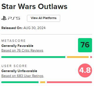 截至发稿,《星球大战:亡命之徒》M站评分76,《尘路之旅》M站评分68,《剑星》M站评分81,《黑神话:悟空》M站评分82。另外,玩家口碑更是差距明显,前两款游戏的评测中充满了玩家对多样性人物塑造的指责。