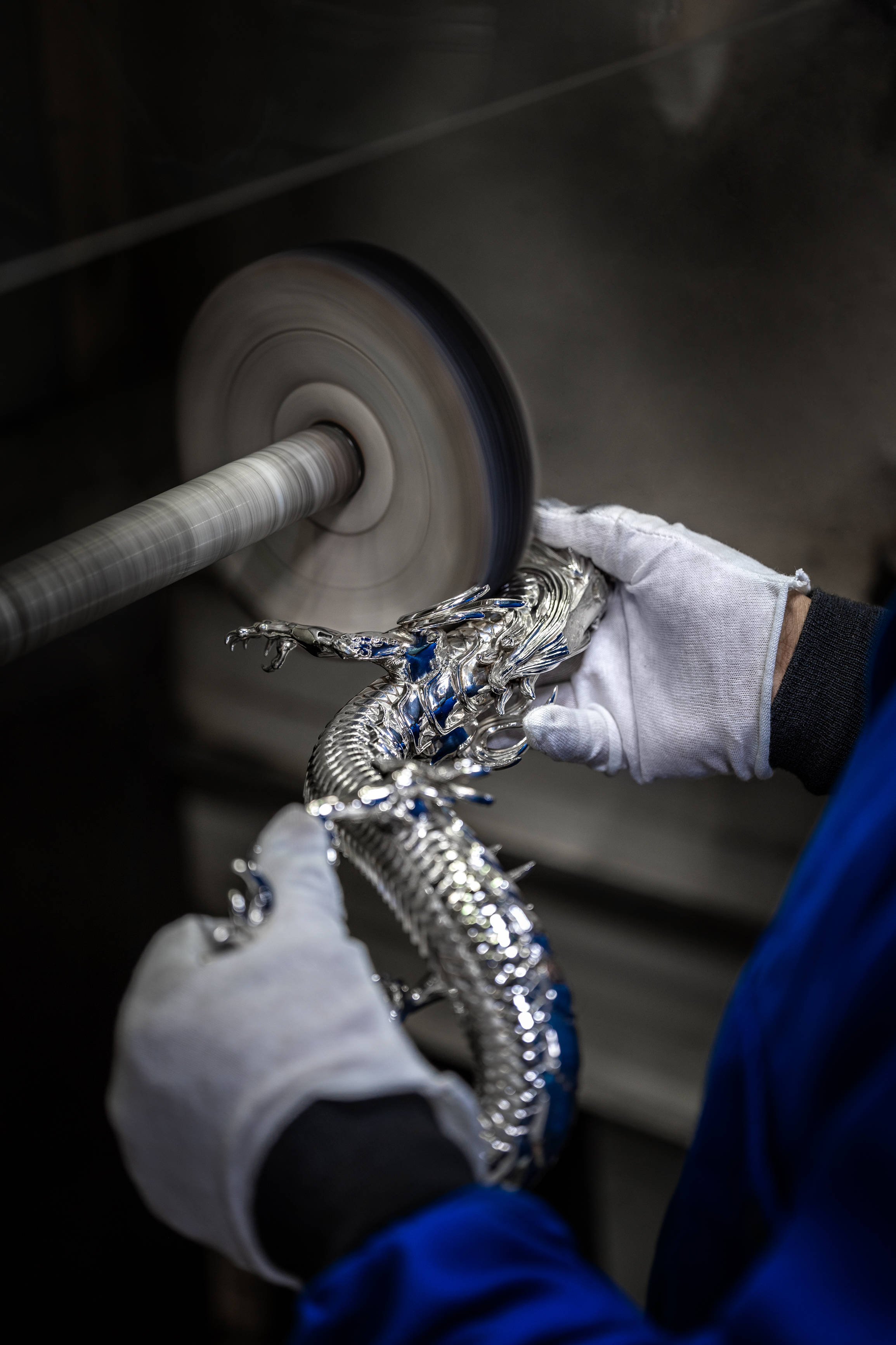 为了完美呈现这条银龙的细节,蒂芙尼的工匠大师们倾注了大量心血。在位于美国罗德岛州的蒂芙尼器具工坊,经验丰富的工匠们运用代代相传的传统工艺,结合尖端的创新技术,历时7个多月,耗费710个小时,才最终完成了这件艺术杰作。