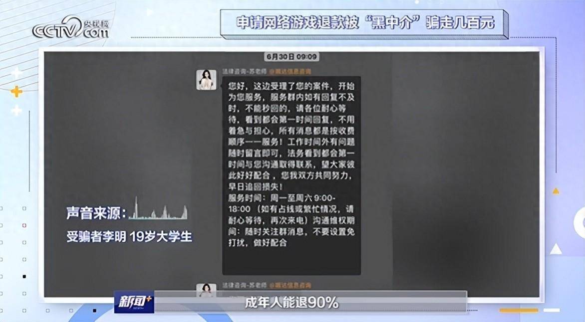 然而,这些保障未成年人合法权益的举措,却被一些不法分子利用,变成了诈骗的幌子。近日,有网友向央视网《新闻+》记者反映,在申请网络游戏退款时遭遇“黑中介”。有商家在一些交易平台发布广告,宣称成年人也可申请网游退款,只需交纳几百元“服务费”即可代为退款,还有专业法律团队提供帮助。
