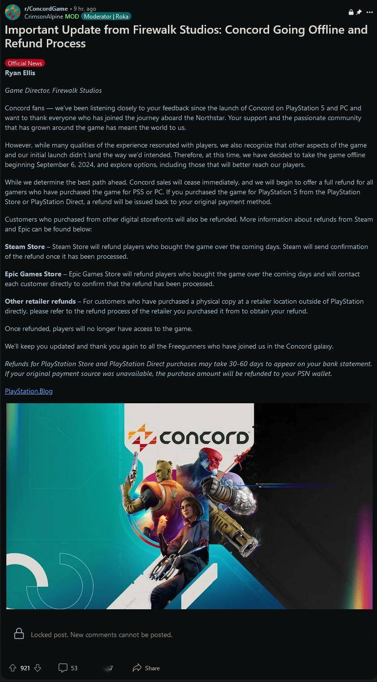 目前有玩家指出,索尼似乎并不希望玩家对这款游戏的失败进行更多的讨论。在社交媒体推特上,PlayStation 官方账号宣布游戏即将下线的公告被关闭了评论。当然这并没有阻止玩家社区通过转发或是单独发帖进行热烈的讨论。目前“Concord”已经登上了推特游戏话题榜首。