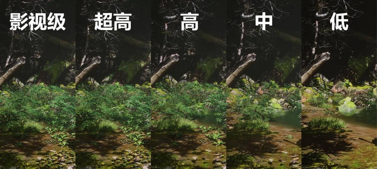 先说“画质等级”,游戏内提供了“低”、“中”、“高”、“超高”、“影视级”这五个画质选项,画质等级越高,五者之间的区别在于植被的数量,阴影的深浅程度,水池的细节等等,其中,“中”等级是个人能接受的下限,并建议尽量选择“超高”和“影视级”。