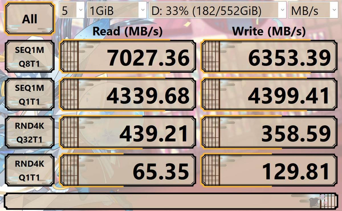 值得一提的是,在玩的过程中,我发现拯救者Y9000P进入游戏和读取进度条的时间非常短。显然,这得归功于内置的这块PCIe 4.0 SSD固态硬盘,在CDM读写测试软件中,顺序读写超过了7000MB/6000MB/s,4K随机读写也有400MB/300MB/s以上,表现是相当不错,而且也贴心地预留了第二块M.2硬盘位方便扩展。