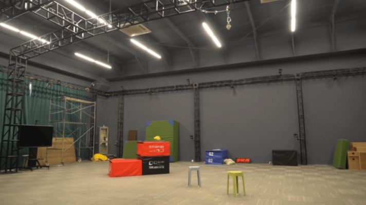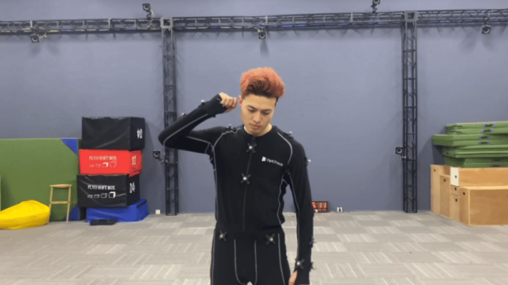 动作捕捉演员殷凯身着动捕服正在进行拍摄。受访者供图