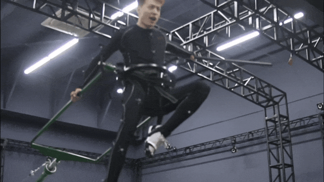 身穿黑色动捕服,全身粘上反光点,在特定的空间范围内做扮演角色的动作,是殷凯的工作日常。