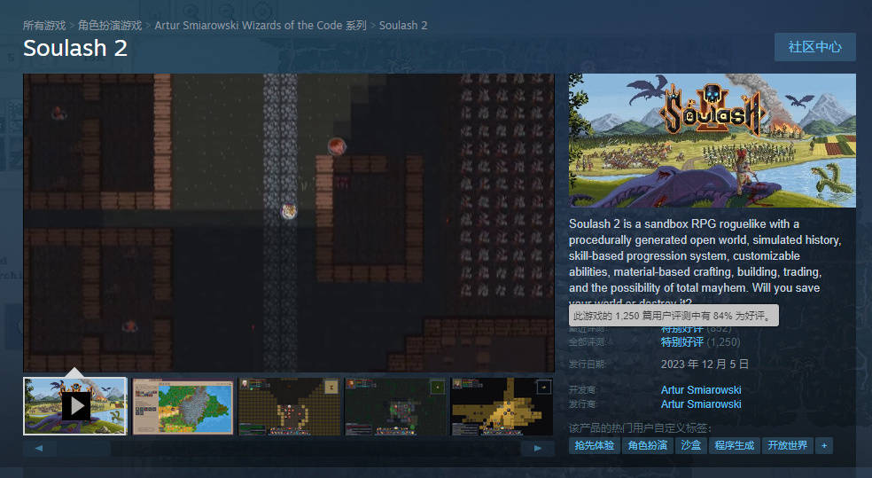 由Artur一人开发的像素风格Roguelike RPG游戏《Soulash 2》自2023年底在Steam平台开放抢先体验以来,获得了84%的好评率。游戏特色在于自由探险、交易、建立领地和家族传承,玩家可与异性NPC结婚并延续后代,角色死亡后代可以继续冒险。