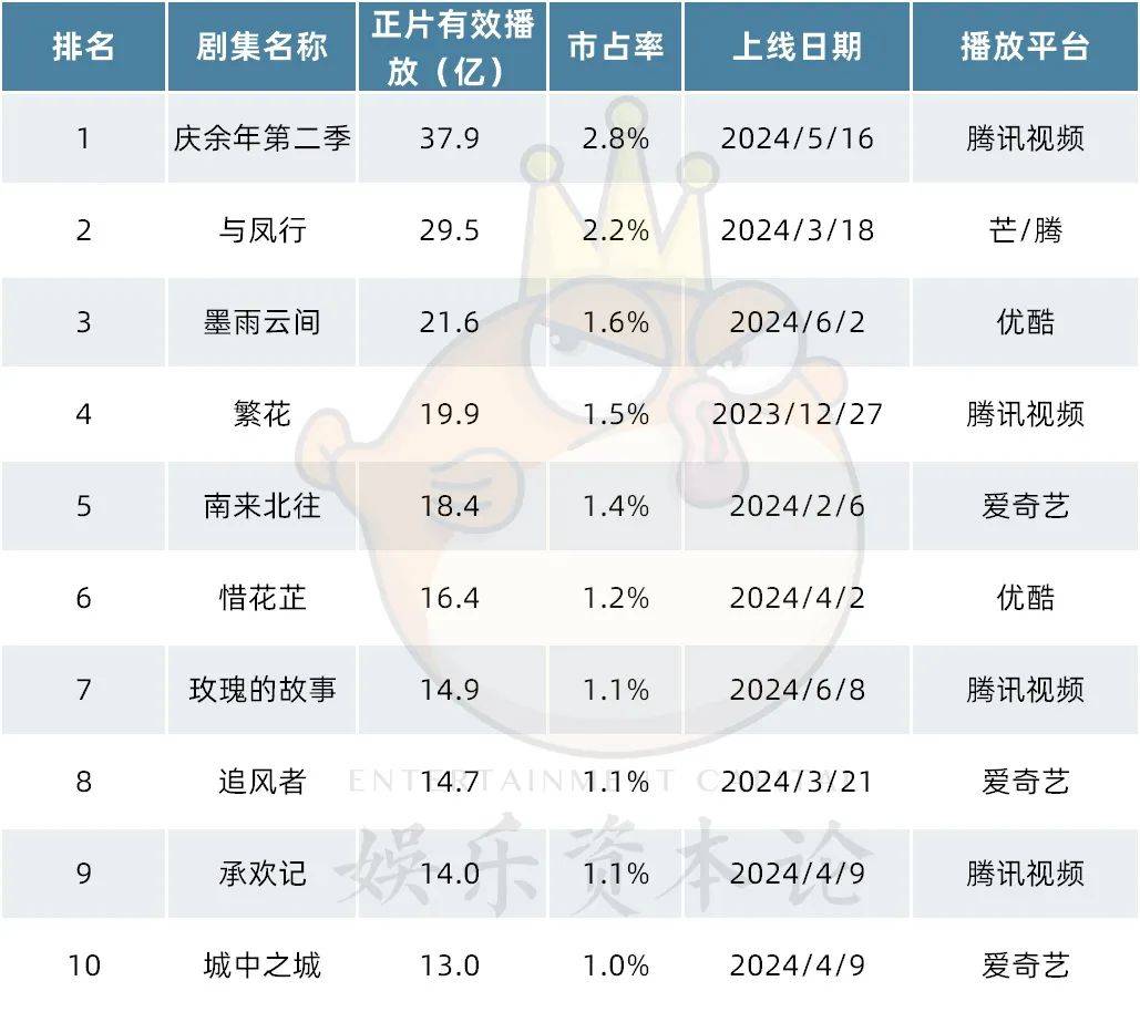 根据云合数据公布的2024上半年全网剧集有效播放榜单,前四名中腾讯占据三席;爱奇艺第二季度上榜的剧集仅有《追风者》和《城中之城》两部,爱奇艺自己也在业绩会上称剧集表现起伏较大。