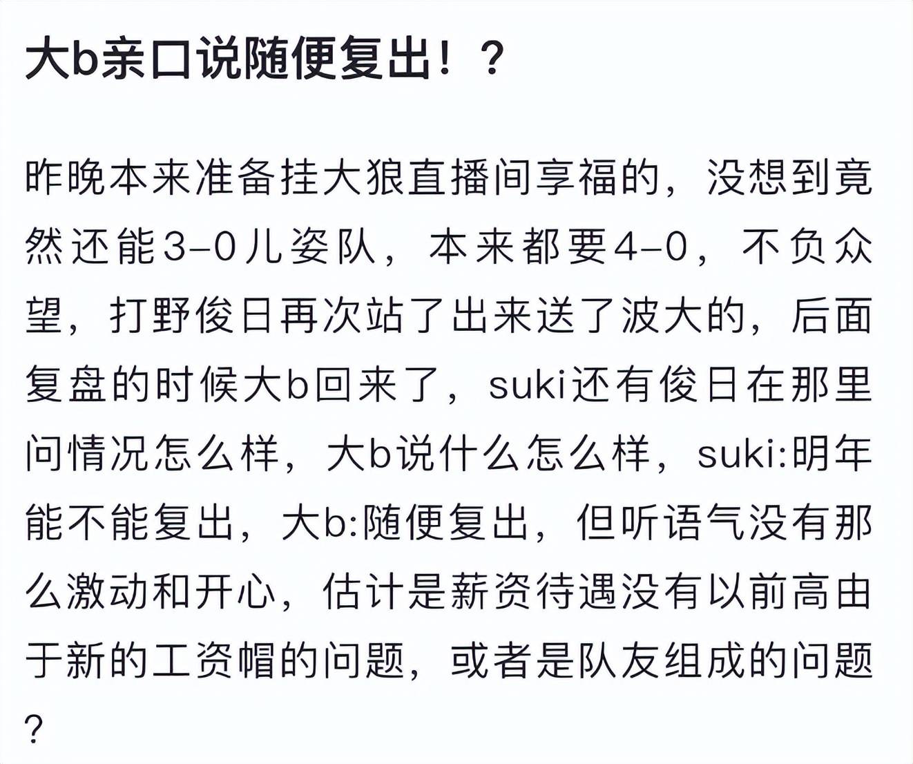 但很多人都觉得Doinb这是在玩梗,说的也都是假话。因此Suki和俊日在近日训练赛打完之后,又专门去找Doinb求证,而后得到了准确的答复,很多战队都对硬币哥有想法,用金咕咕本人的话来说那就是随便复出,没有难度。