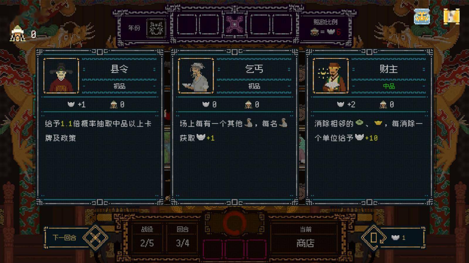 这是一款肉鸽卡牌筑造游戏。 在这片江山下,皇上需通过选择各式卡牌加入牌组,用英明的决策应对不同年份和朝变而造成的影响。不断增强国力,维护国朝安邦,抵御外敌入侵。 江山如此多娇,但是非福祸也很多...愿皇上一路buff叠满,国祚绵延,万世千秋。
