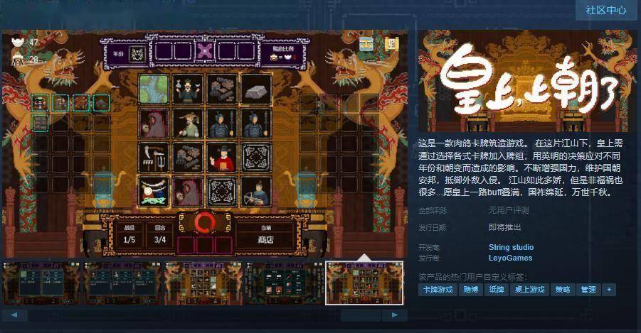 今日(9月7日),肉鸽卡牌筑造游戏《皇上,上朝了》Steam页面上线,游戏支持简体中文,发售日待定,感兴趣的玩家可以进入商店页面。