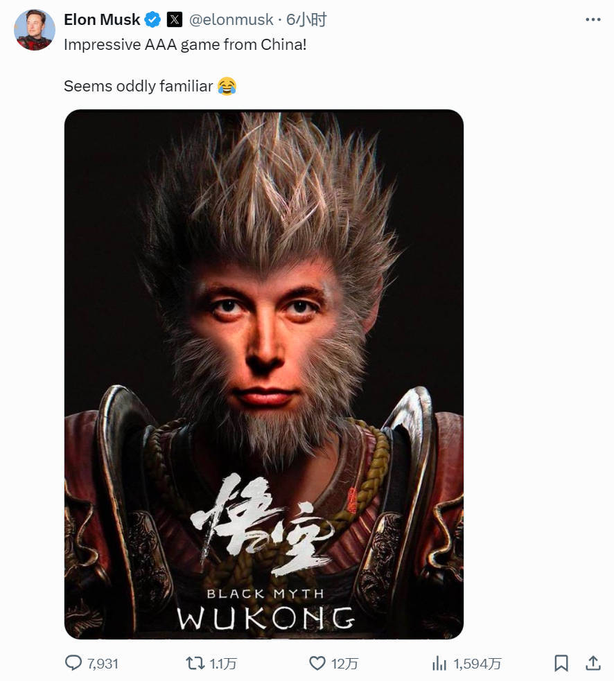 马斯克写道:“来自中国的令人印象深刻的3A游戏!似乎莫名熟悉。”