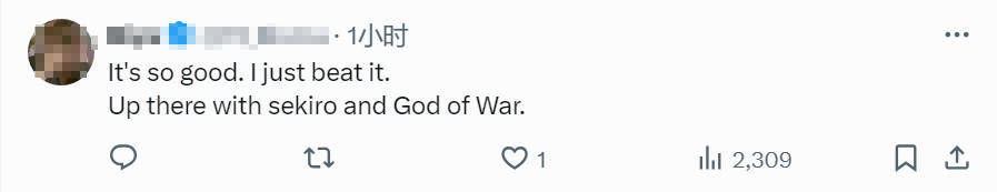 “这游戏太棒了!我刚通关,感觉和《只狼》、《战神》并驾齐驱。”